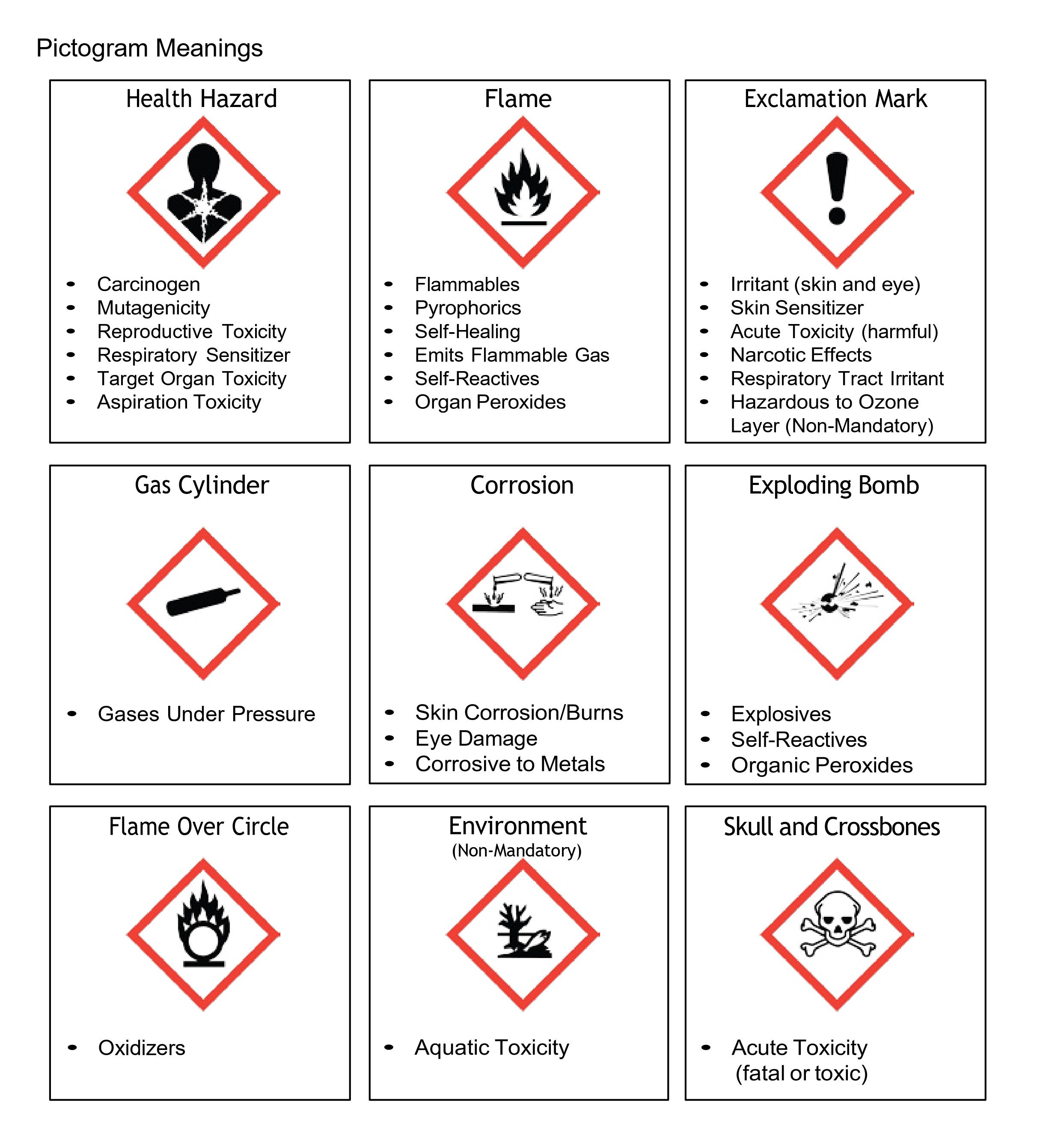 - Labels: Chemical manufacturers and importers will be required to provide a label that includes a harmonized signal word, pictogram, and hazard statement for each hazard class and category. Precautionary statements must also be provided. See image below for a sample label. A pictogram chart can be found at the bottom of this page.